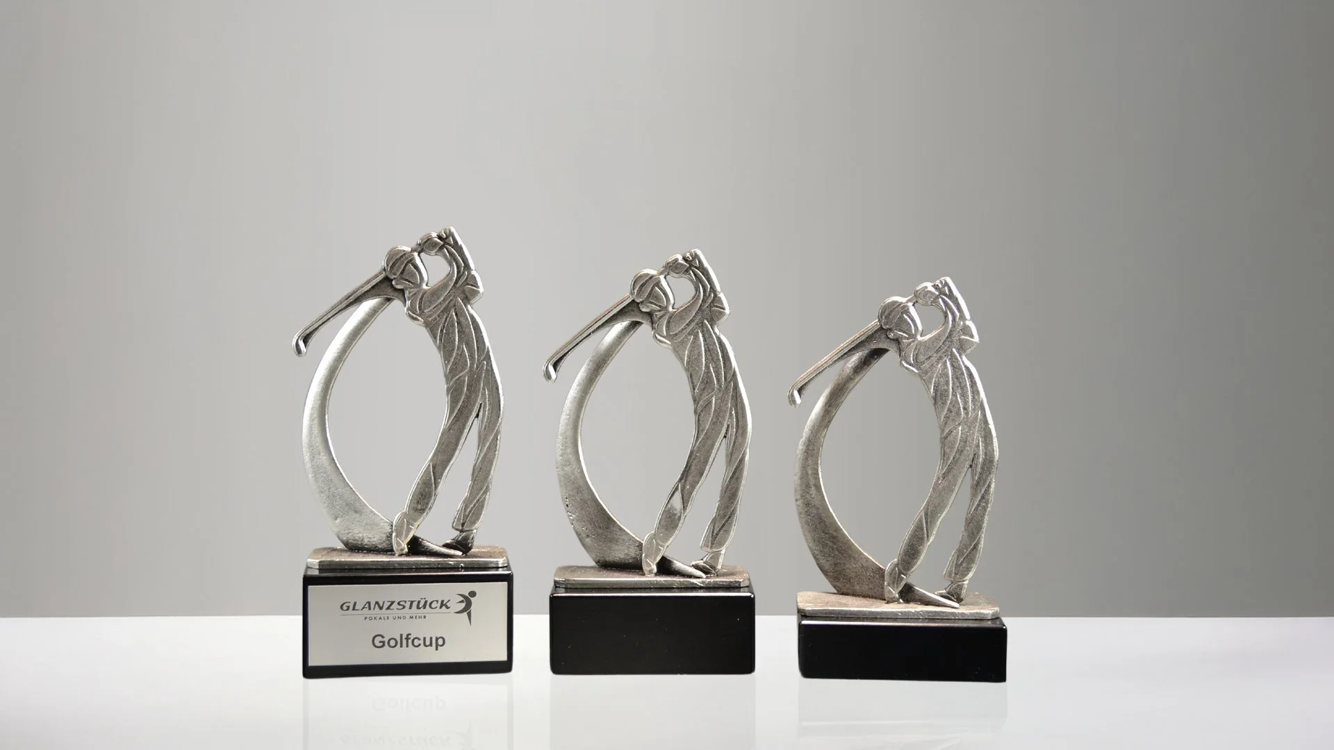 Diese silberfarbige Golferfigur, mit einer Höhe von 15 cm (ohne Sockel), beeindruckt durch ihre detailreiche Ausarbeitung und den sicherbaren Schwungring. Die präzise Gestaltung fängt den eleganten Schwung des Golfsports perfekt ein.