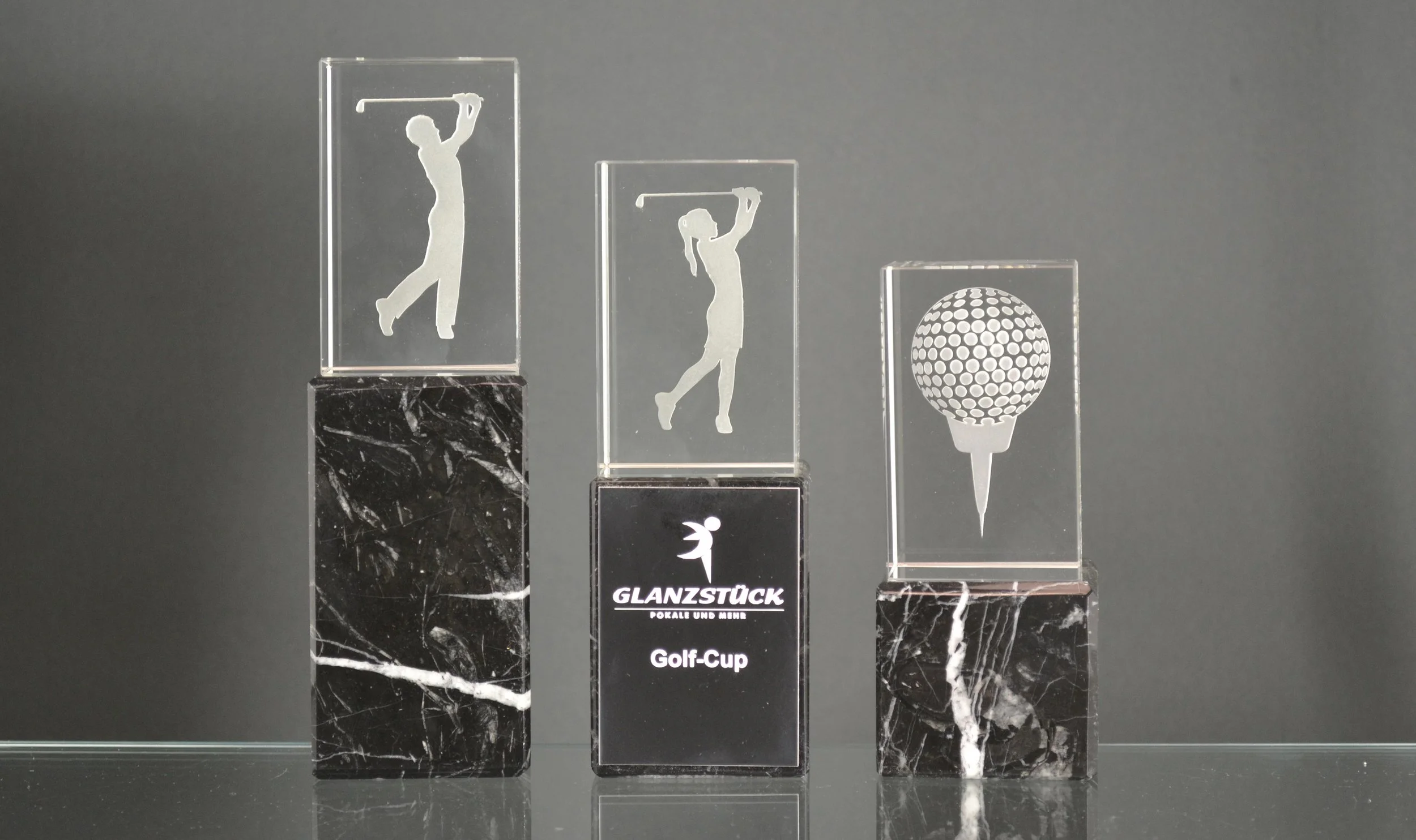 Massive Glasquader in 5 x 5 x 8 cm mit einer tiefen Sandstrahlung von Hinten, sehr plastisch und wirkungsvoll. Aufgesetzt auf Marmorsockel in 10 + 7 + 5 cm Höhe, Gravur auf mit einem angepassten Kunststoff Gravurschild in schwarz mit weißer Schrift. Herren und Damen werden laut Standartgravur verwendet, Wahlweise auch mit: T=Tee mit Ball, bitte angeben. Gesamthöhe der Quader 18 + 15 + 13 cm (4. Höhe und andere Spezifikationen lieferbar).