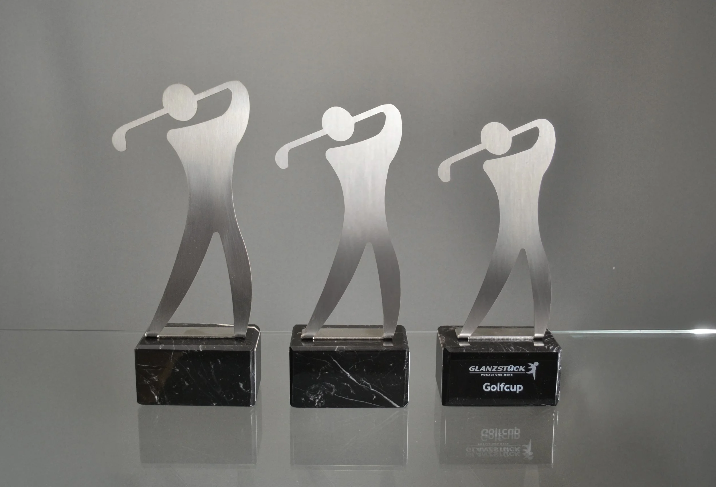 Die formschönen Figuren aus hochwertigem Edelstahl sind ohne Sockel 23 + 21 + 19 cm hoch und überzeugen durch ihre moderne, elegante Ausstrahlung. Sie stehen auf einem schwarzen Marmorsockel im Format 5 x 5 x 10 cm. Eine stilvolle Gravur auf einem schwarzen Metallschild mit silberner Schrift macht jedes Stück zu einem ganz besonderen Blickfang bei Ihrer Siegerehrung.