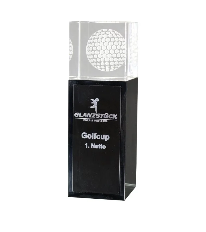 Dieser elegante Schwarzglasquader wird durch einen aufgesetzten Klarglaswürfel ergänzt, in dem ein sandgestrahltes Motiv eines Golfballs dargestellt ist. Die Gravur erfolgt präzise durch Sandstrahlung. Basis für diese edlen Aufsteller sind unsere massiven Glasquader in den Maßen 5 x 5 cm und 4 Höhen: 5 cm, 8 cm, 10 cm und 12 cm. Diese sind in verschiedenen Ausführungen erhältlich: Schwarz, Klar oder farbig schimmernd. Bei klarem Glas bitte angeben: KL für Klar, R für Rot, G für Grün oder B für Blau.