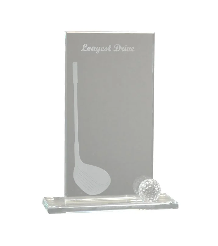 Der hohe Glasaufsteller mit "Longest Drive"-Sandstrahlungsmotiv überzeugt durch sein schlankes, modernes Design aus 8 mm Opti White Glas. Mit einer Breite von 9 cm und einer Höhe von 17 cm ist er eine elegante Wahl für stilvolle Auszeichnungen.