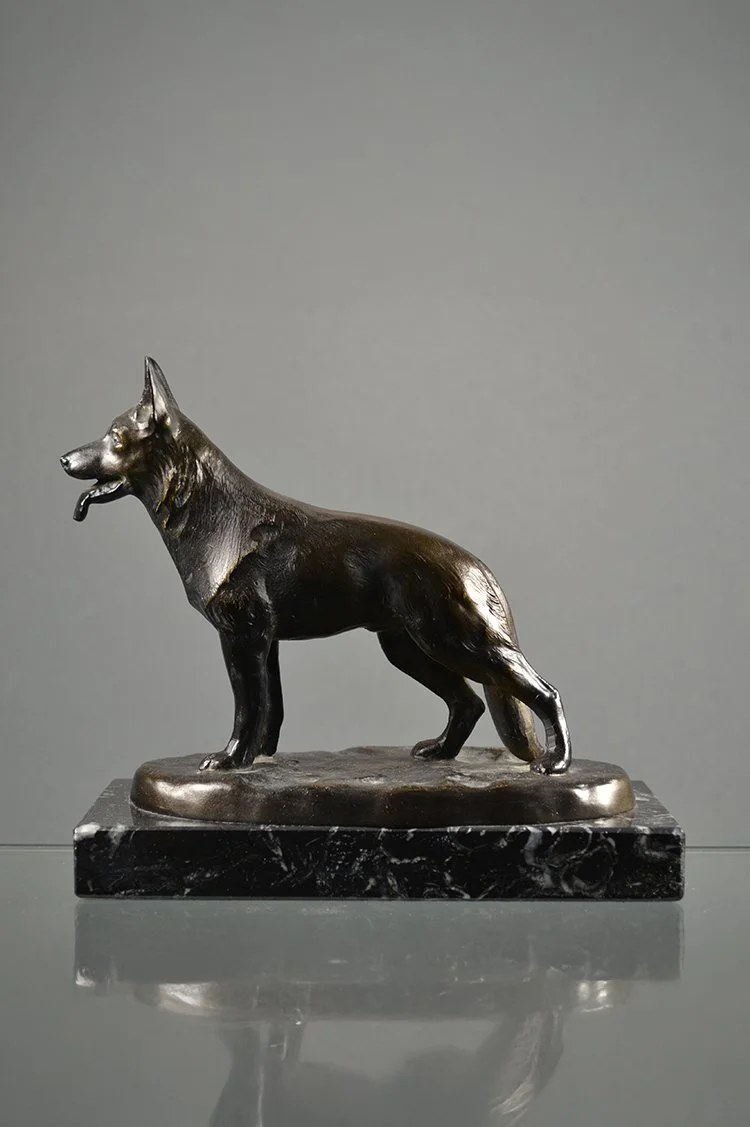 Schäferhund aus schwerem Metallguss auf Marmorsockel. Größe insg. (HxB): 15x15 cm. Größe Sockel (HxBxT): 2x17x7 cm.