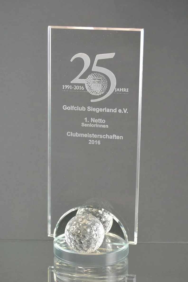 Ob klares Glas, satiniertes Design oder edle Gravuren – unsere Glasaufsteller verleihen Ihrer Golfsport-Leidenschaft einen modernen und raffinierten Touch. Ob im Clubhaus, im Büro oder auf dem Golfplatz, sie setzen Ihre Auszeichnungen oder Erinnerungen an besondere Momente perfekt in Szene und sorgen für einen stilvollen Blickfang. Alle Teile in bekannt bester Qualität und auf Wunsch mit Logo und Text graviert!