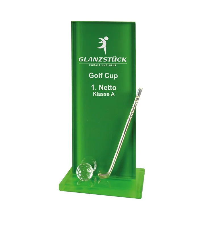 Ob in kräftigen Farben, sanften Tönen oder mit individuellen Farbakzenten – unsere farbigen Glasaufsteller bringen dynamische Akzente in Ihre Golfsport-Dekoration. Perfekt geeignet für das Clubhaus, das Büro oder besondere Events, setzen sie Ihre Erinnerungen an den Golfsport lebendig in Szene und verleihen jedem Raum eine einzigartige, farbenfrohe Note. Alle Teile in bekannt bester Qualität und auf Wunsch mit Logo und Text graviert!