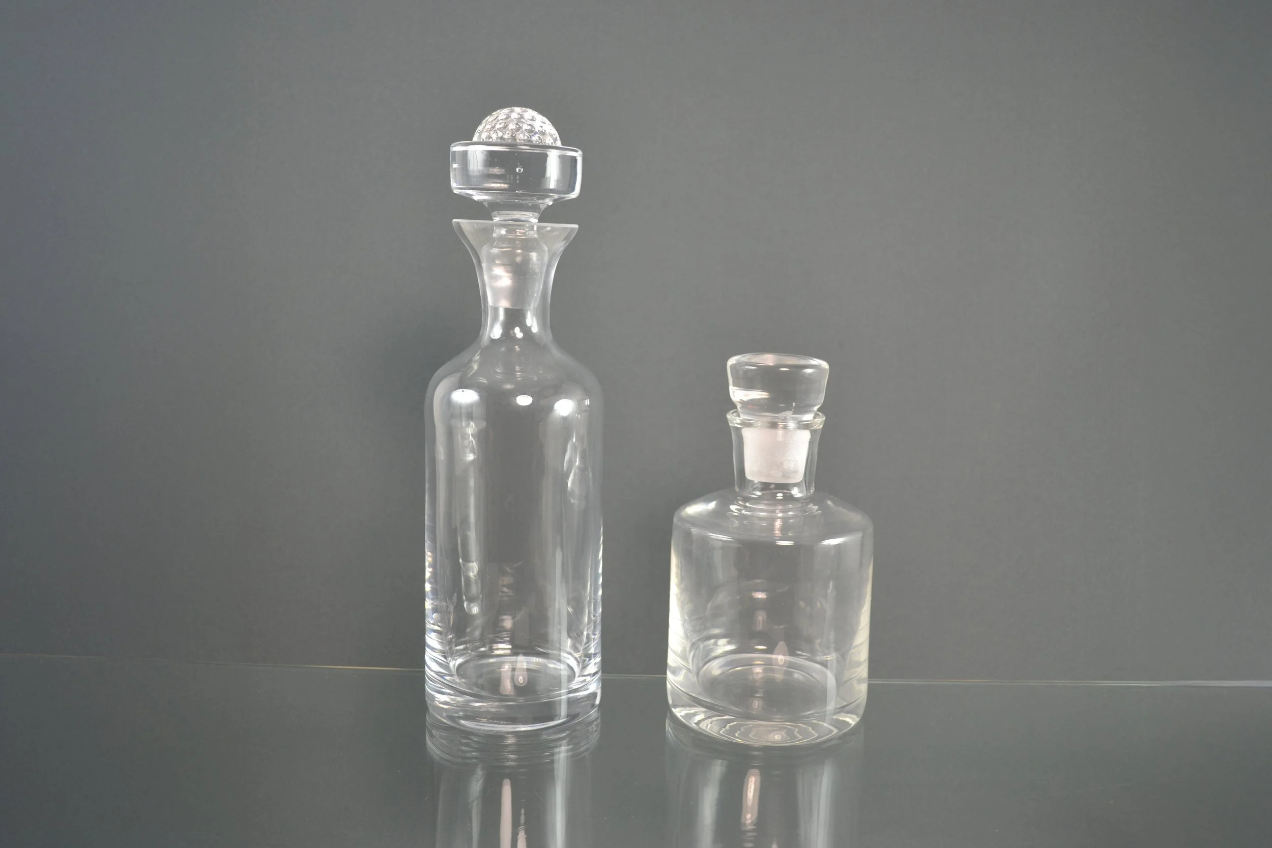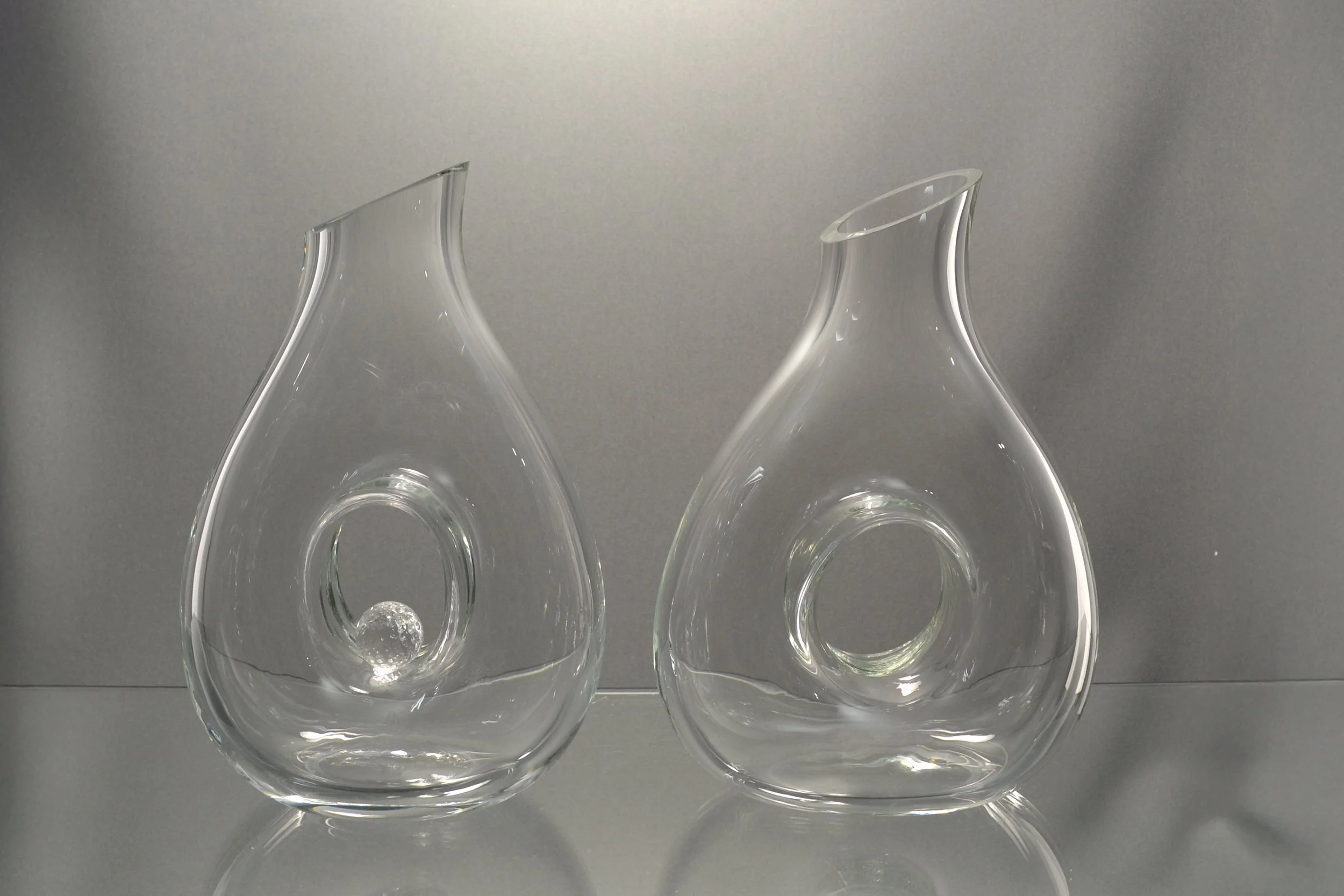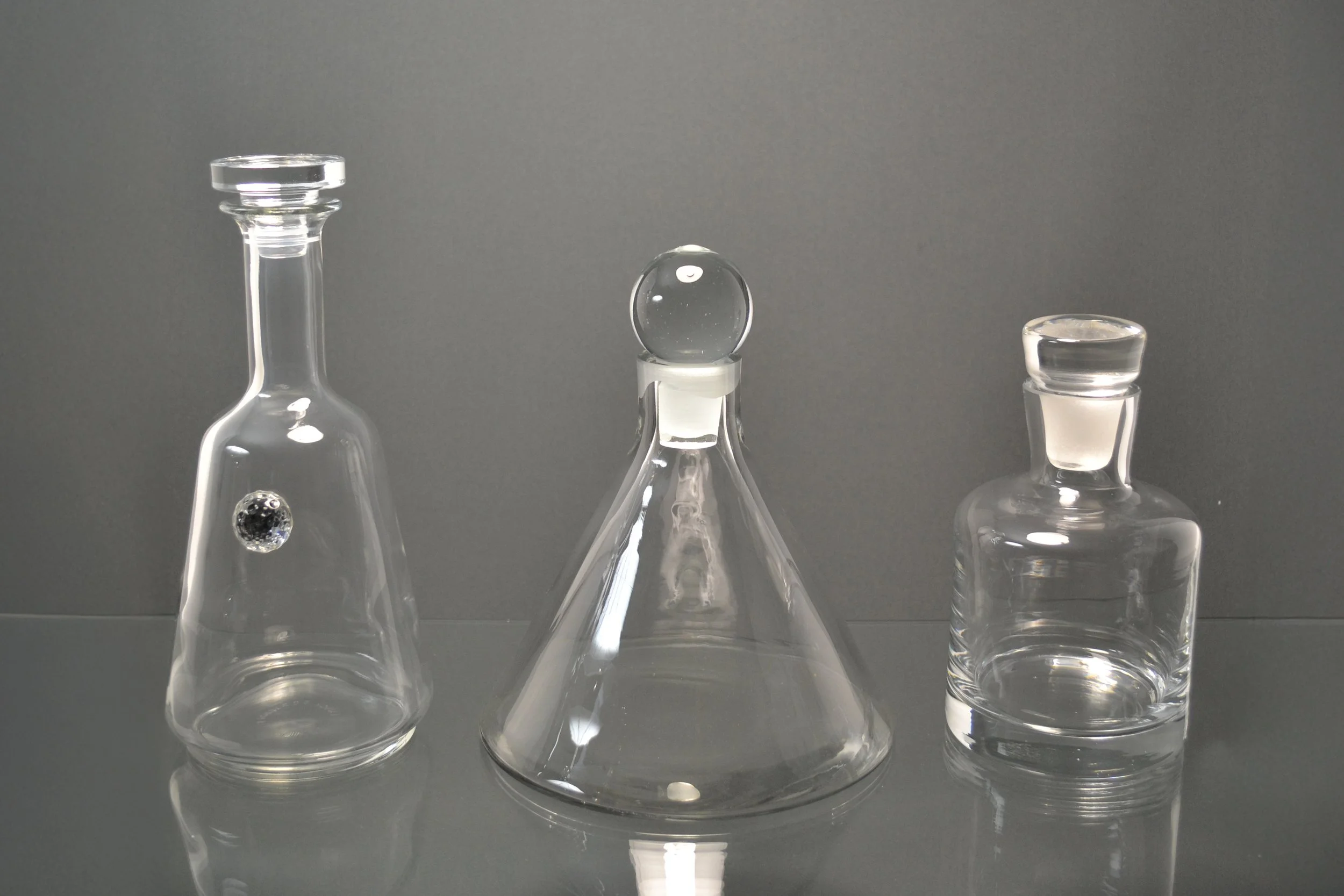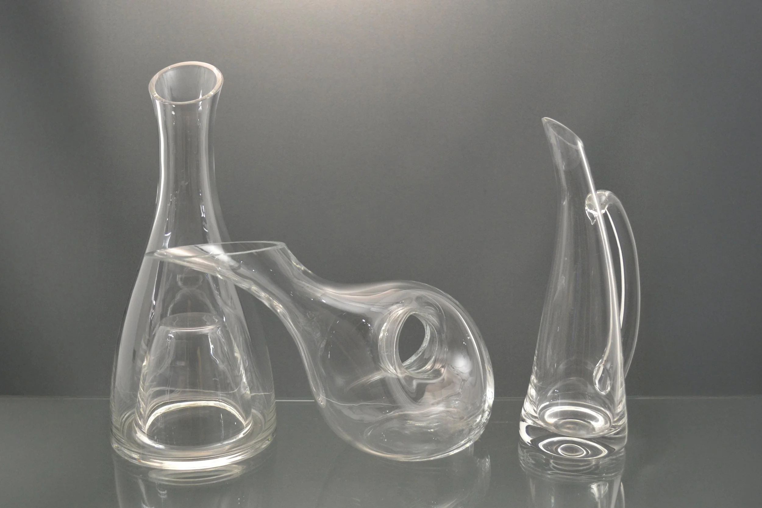 Hochwertige Teile aus der Glashütte Eisch: 2-teiliger Weißweindekanter mit Eiswürfeleinsatz (A), Dekantierente (B) und Karaffe (C)