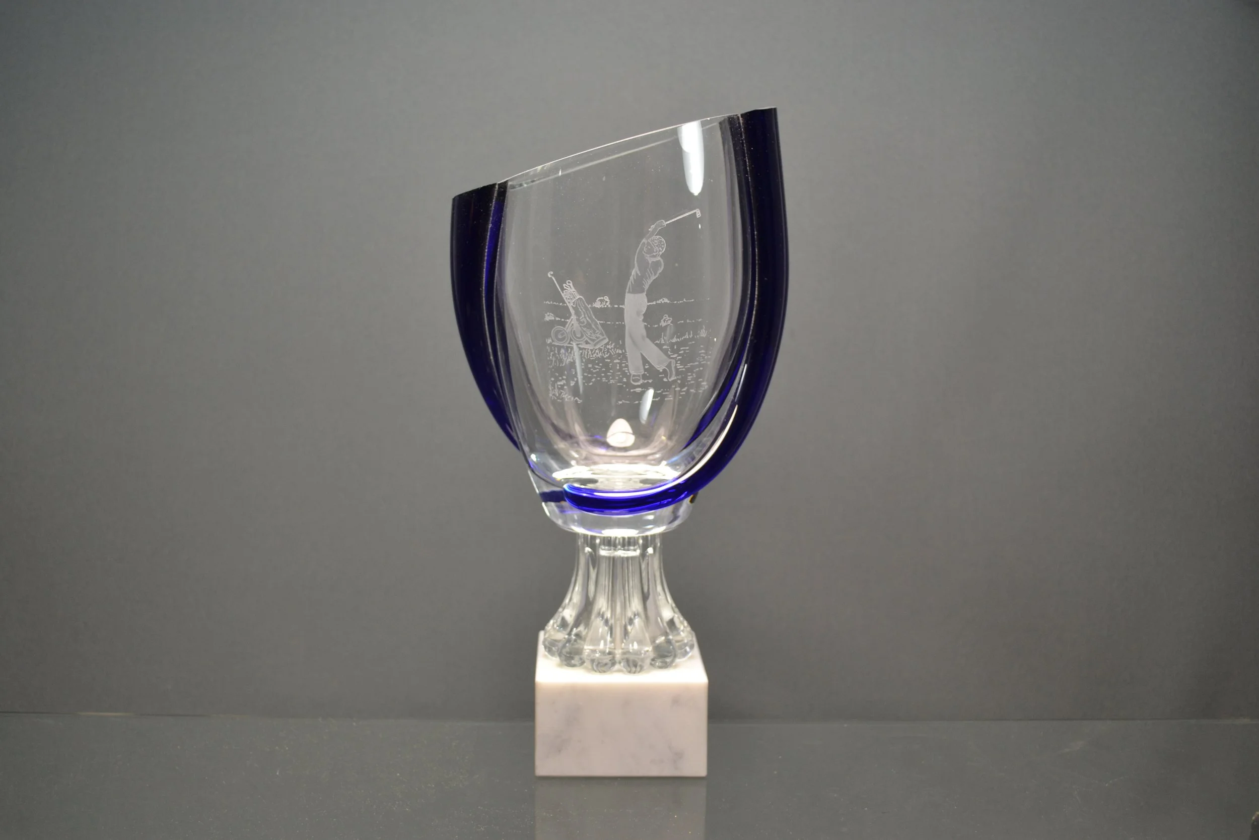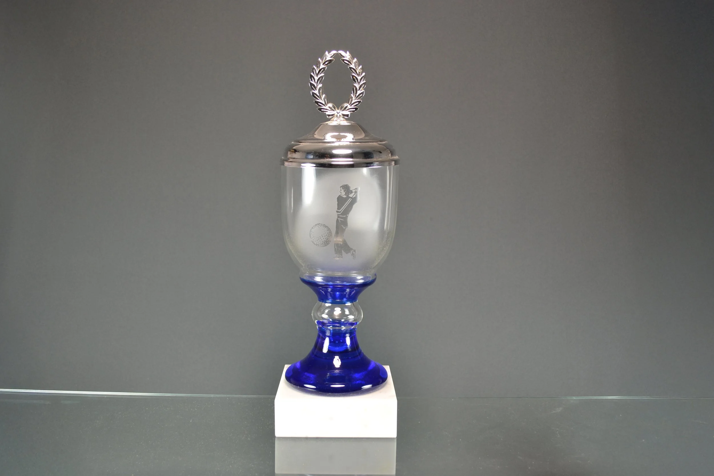 Edler, schwerer Glaspokal auf Glassockel mit Deckel und Golfemblem