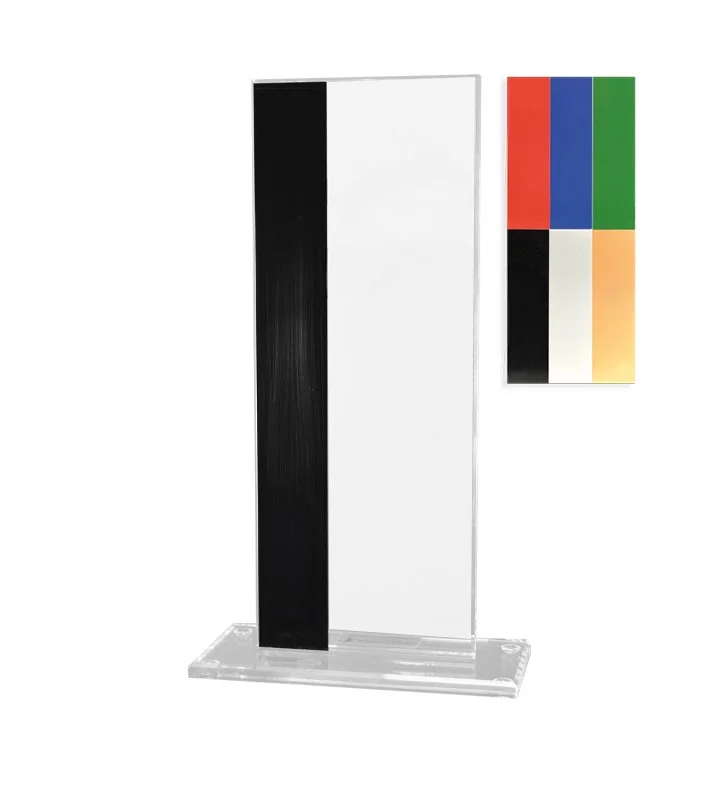 Dieser elegante Glasaufsteller ist gefertigt aus hochwertigem, 10 mm starkem optischen Glas und besticht durch seine präzise Linienführung und zeitlose Form. Ein schmaler Metallstreifen in edler Farbnuance – wahlweise G = Grün, R = Rot, B = Blau, SCH = Schwarz, Ro = Rost, Go = Gold, Si = Silber oder Br = Bronze – verleiht dem Aufsteller eine individuelle Note.