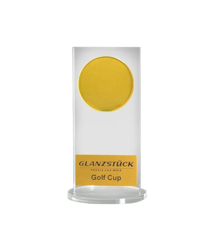 Eleganter kleiner Glasaufsteller (13 x 6 cm, 8 mm stark) auf rundem Glassockel mit Wunschemblem. Die Gravur erfolgt per Sandstrahlung oder mit Schild für ein stilvolles, mattiertes Finish.